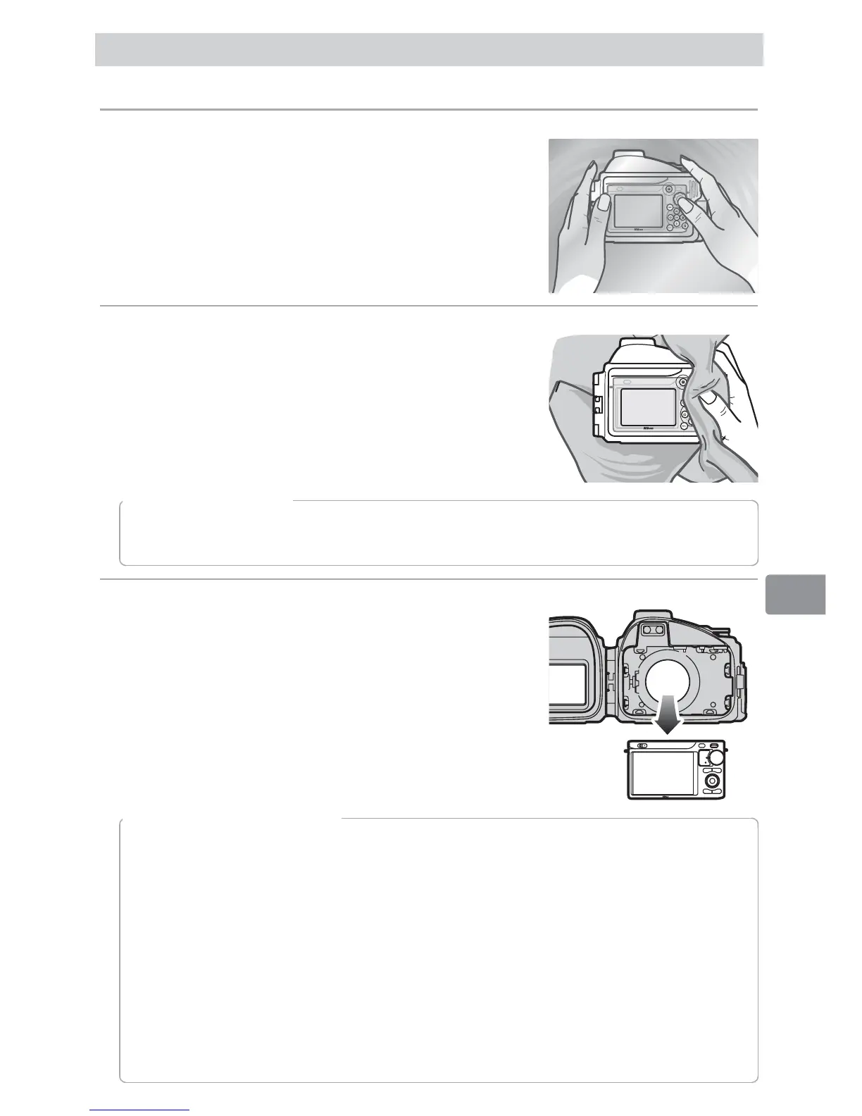 fotocamera. Se cade dell’acqua sulla fotocamera o nella custodia subacquea, asciugarla