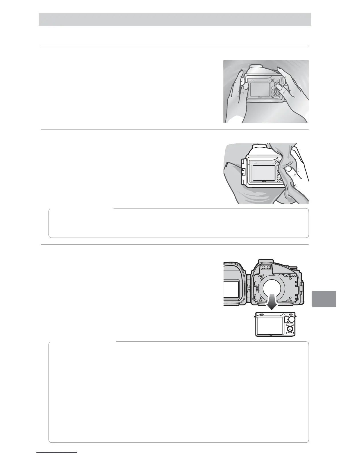안으로나 카메라에 떨어지지 않도록 합니다. 물이 카메라나 수중 케이스 안