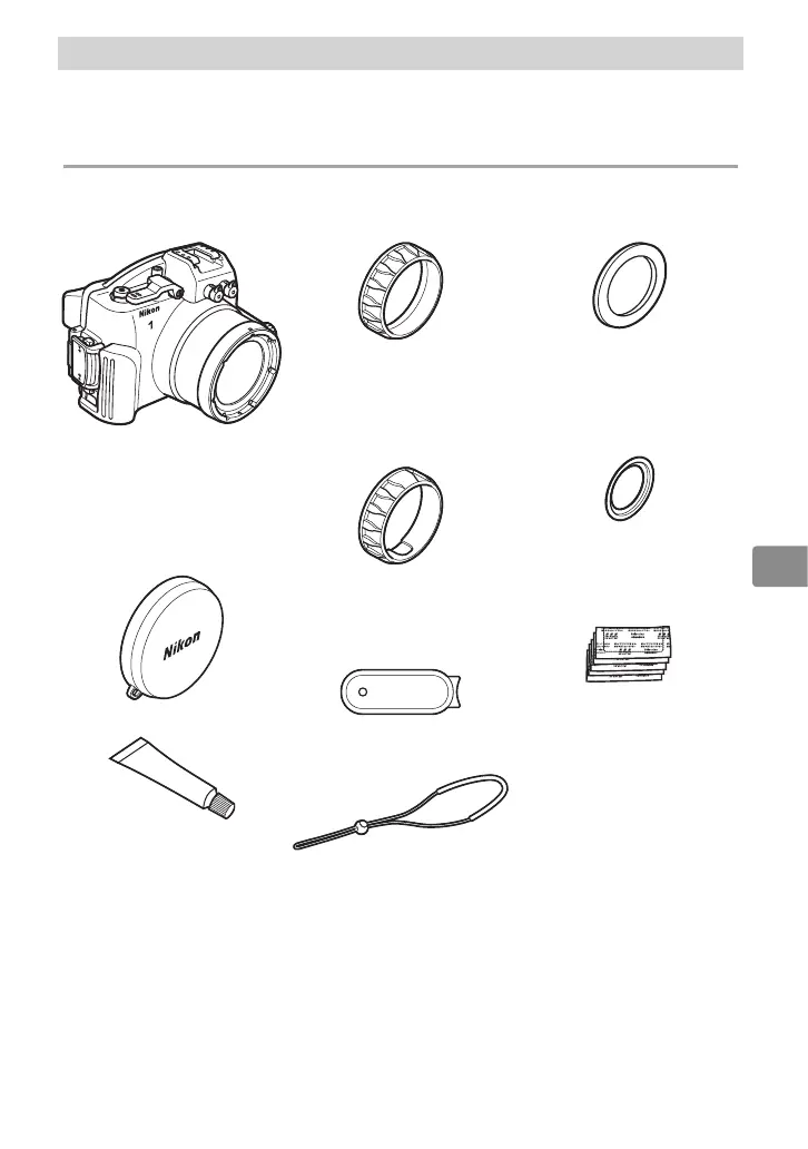 accesorios suministrados y las piezas de la carcasa subacuática.