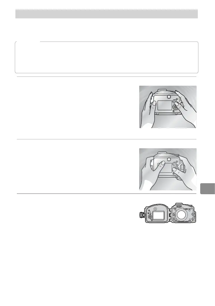 將相機裝入防水罩之前,請按照下文所述鎖定防水罩並將其浸入水中