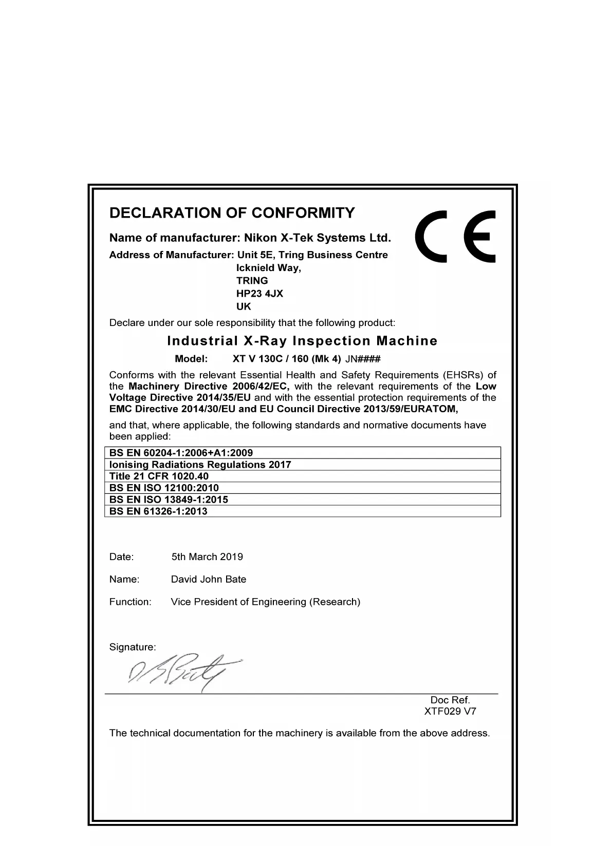 Nikon XT V 160 - Declaration of Conformity; Product Compliance and Standards