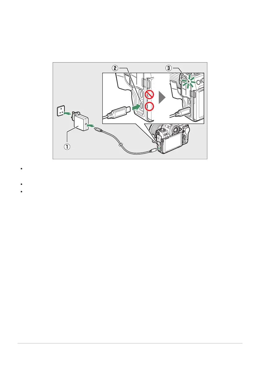 adapter (q). After confirming that the camera is off, connect the other end of the cable to the camera’s