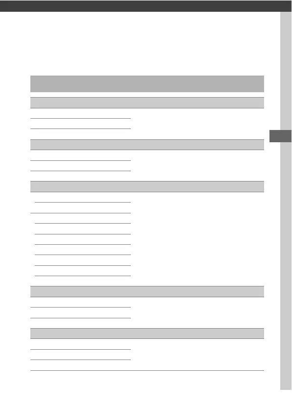 This section lists the options available in the camera menus. For