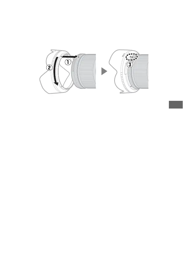Align the lens hood mounting mark (I) with the lens hood