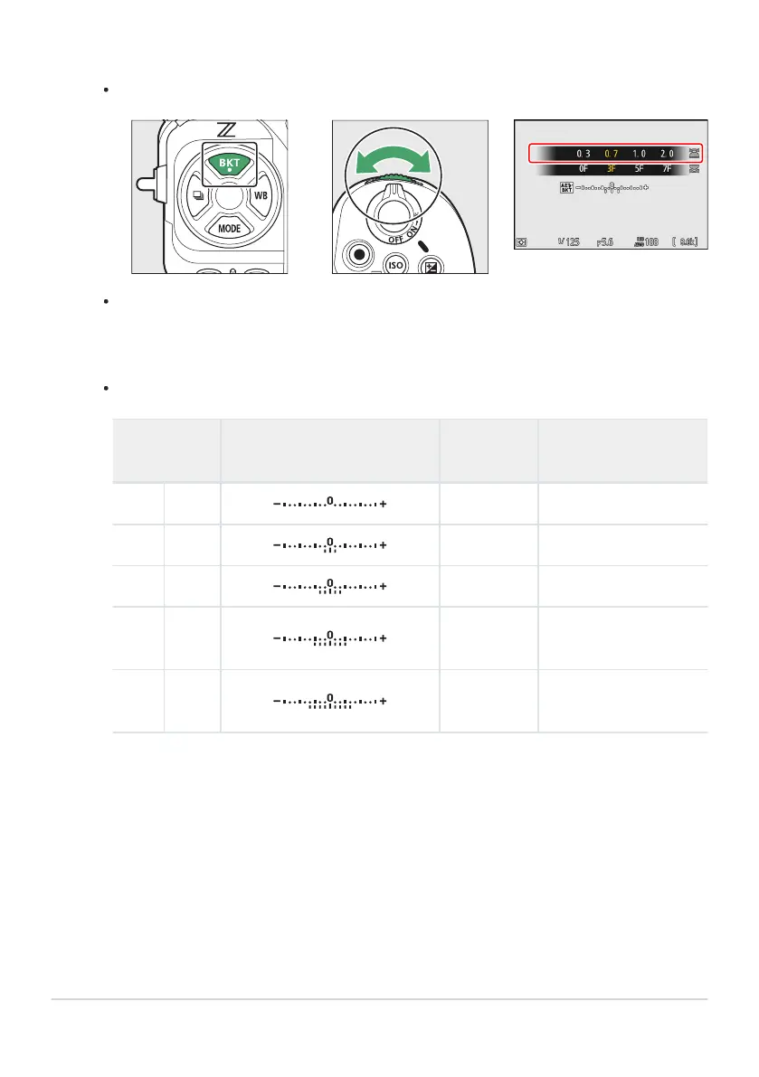 the increment can be chosen from 0.3(¹⁄₃), 0.7 (²⁄₃), 1.0, 2.0, and 3.0EV. Bracketing programs