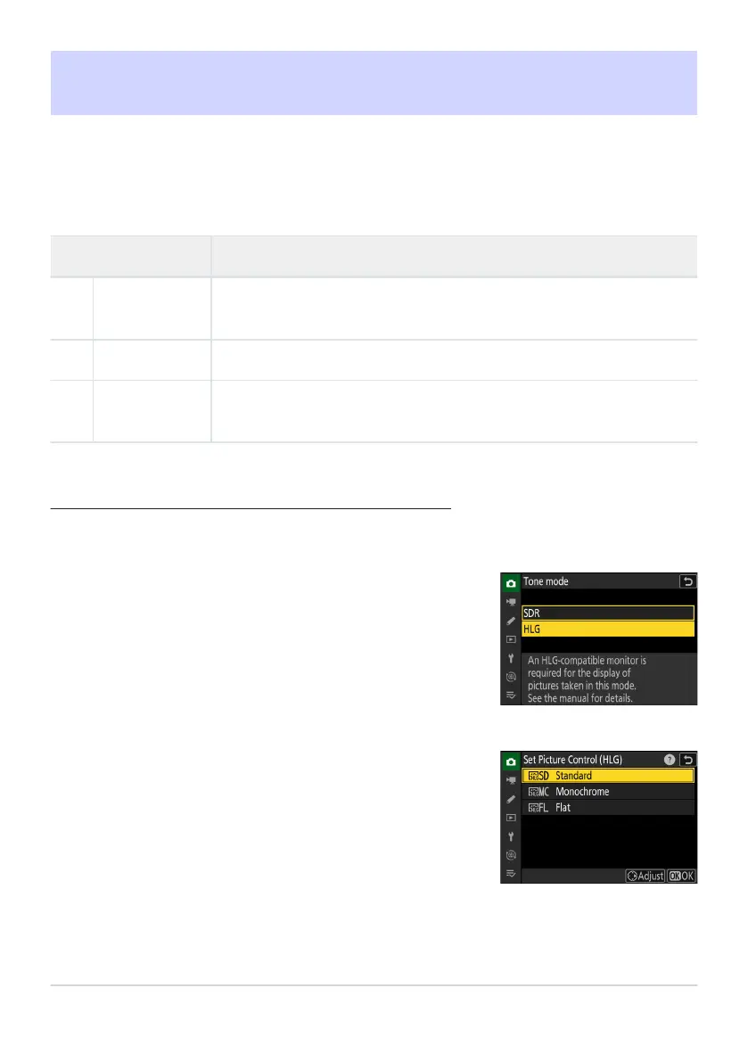 Choose image processing (“Picture Control”) options for photos taken with [HLG] selected for tone