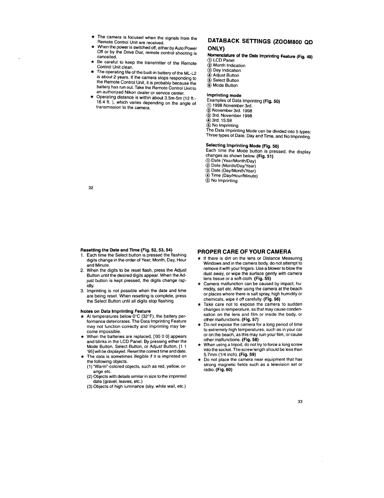 Nikon ZOOM800 - Databack Settings; Imprinting Mode; Selecting Imprinting Mode; Proper Care of Your Camera