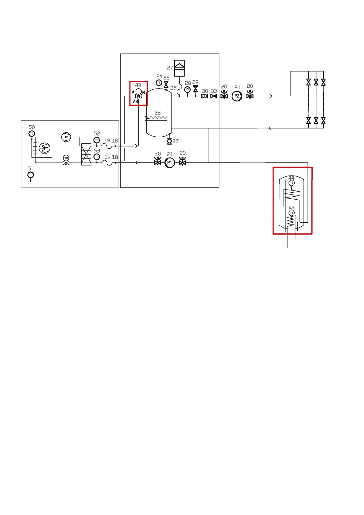 The AIR unit can be connected to an external hot water tank (SHW) or to the hot water tank in the Compact P (DHW). A three-way valve,