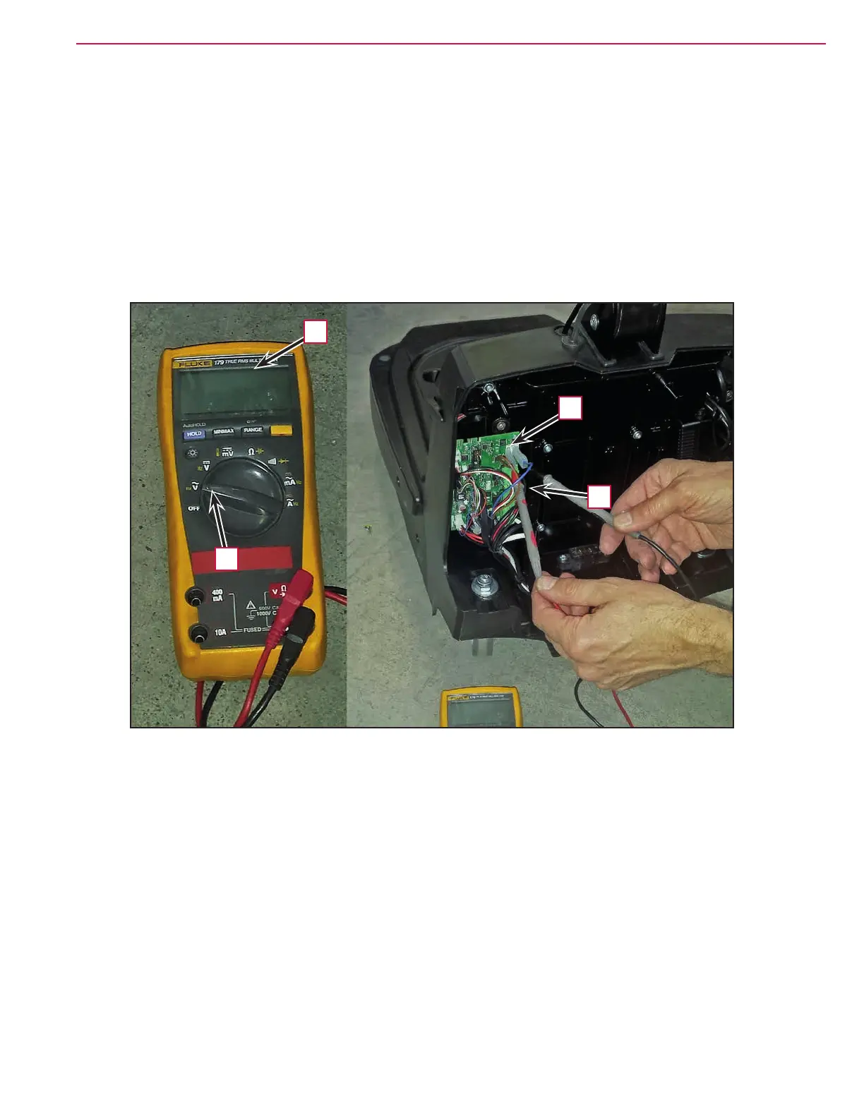 5. With a digital multimenter (D) set to AC input (E), verify that on the output water pump (C) is current