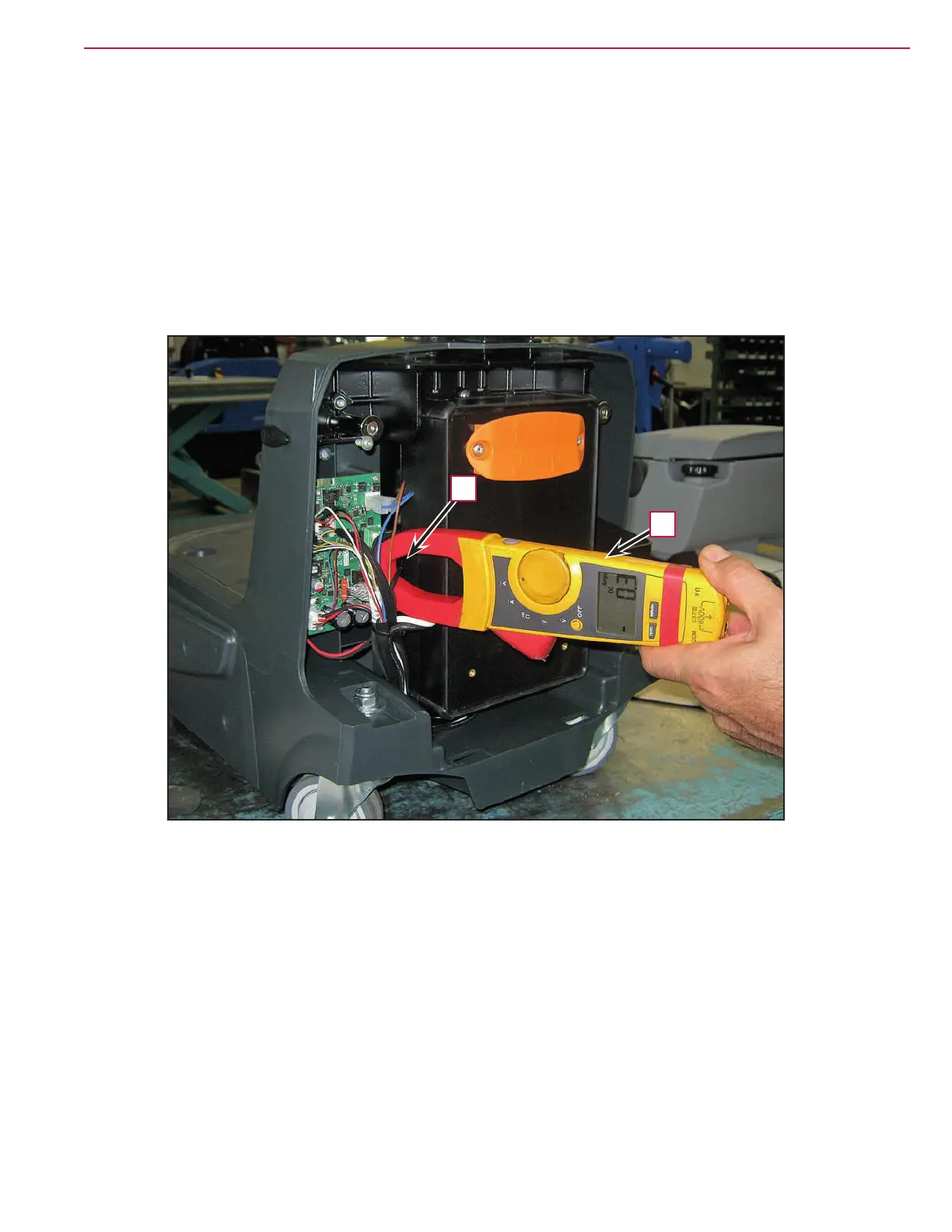 3. Apply the amp clamp (C) to the electrical cable (D) of the brush motor.