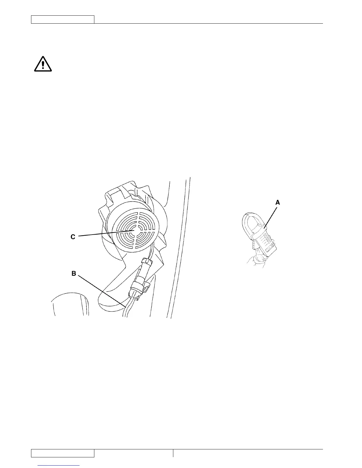Applicare la pinza amperometrica (A) su un cavo (B) del motore dell'impianto di aspirazione (C).