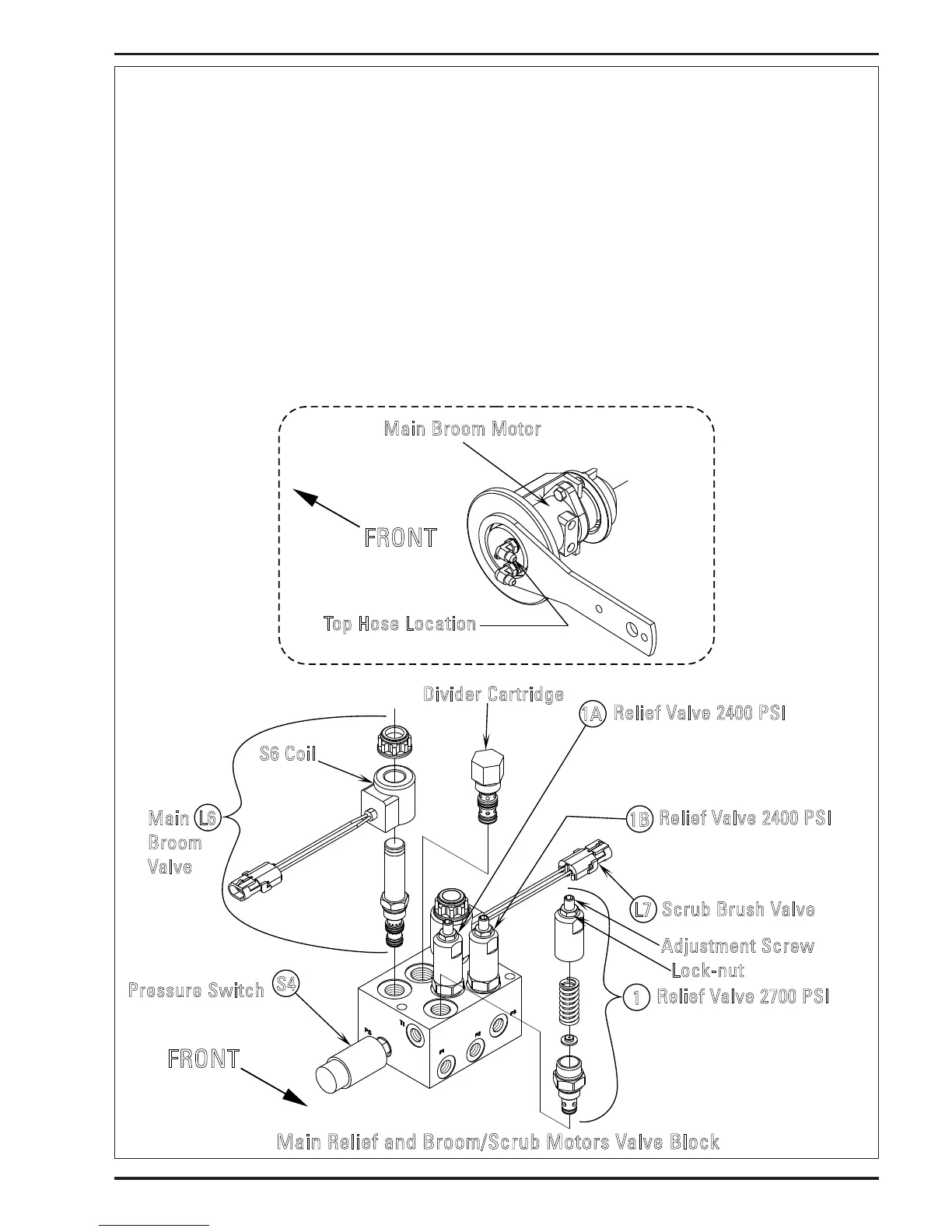 Energize L6 main broom solenoid using the adapter cord. The pump circuit 1 will be in overload use caution not to leave in this