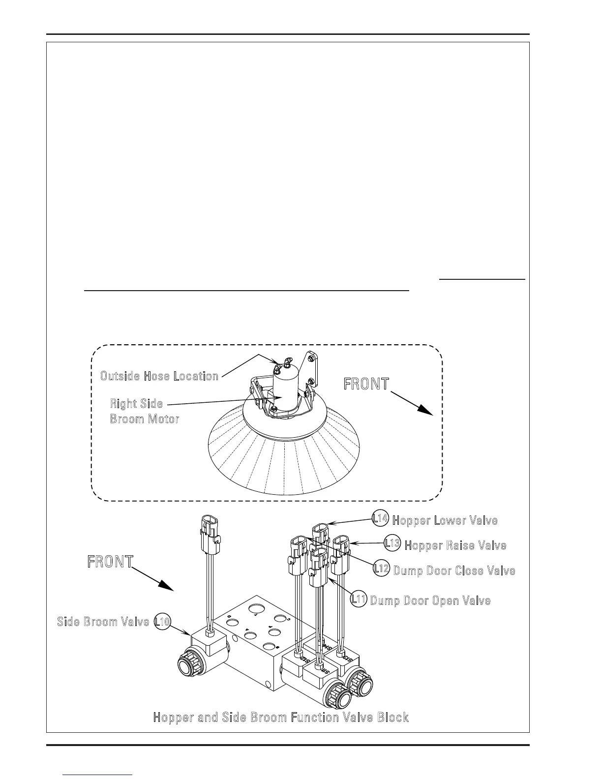 and lower the side brooms. Cap the right side broom drive motor inlet hose # 37 (outside hose at motor). Finish raising the hopper