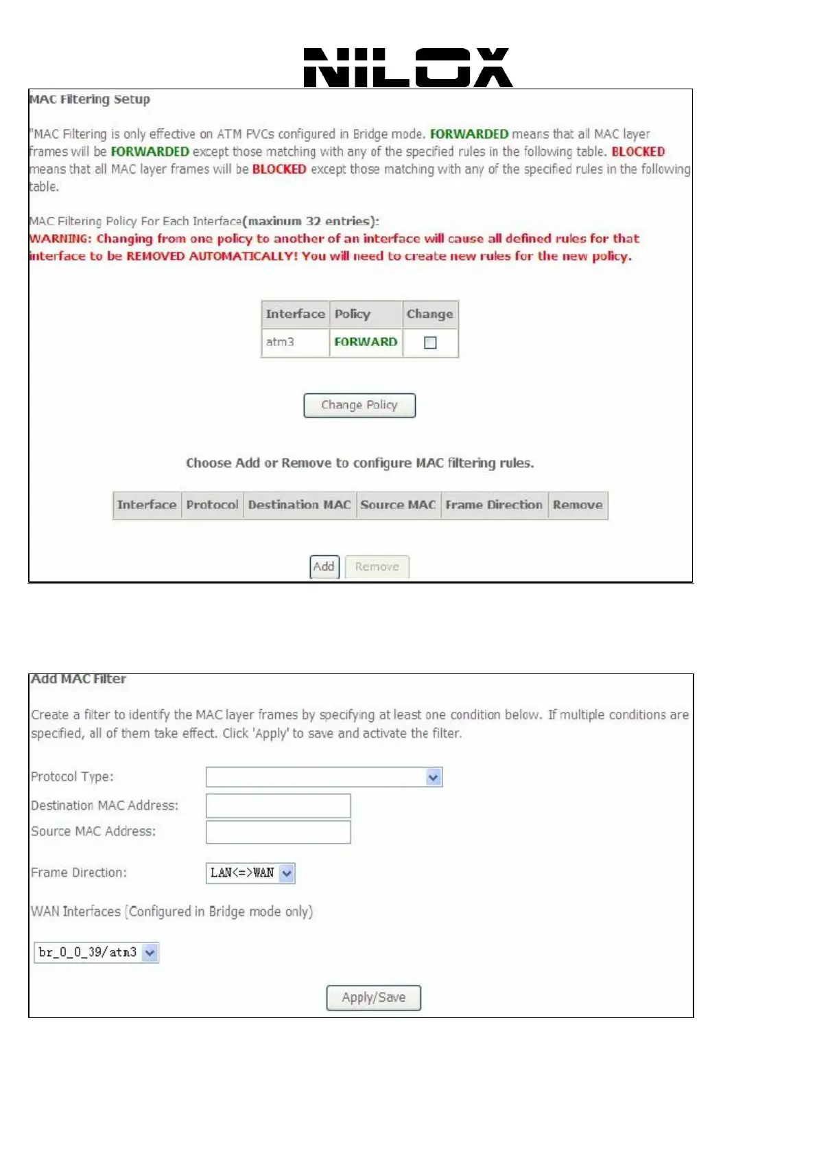 In this page, you can add or remove the MAC filtering rule. You may change the MAC filtering policy from FORWARDED