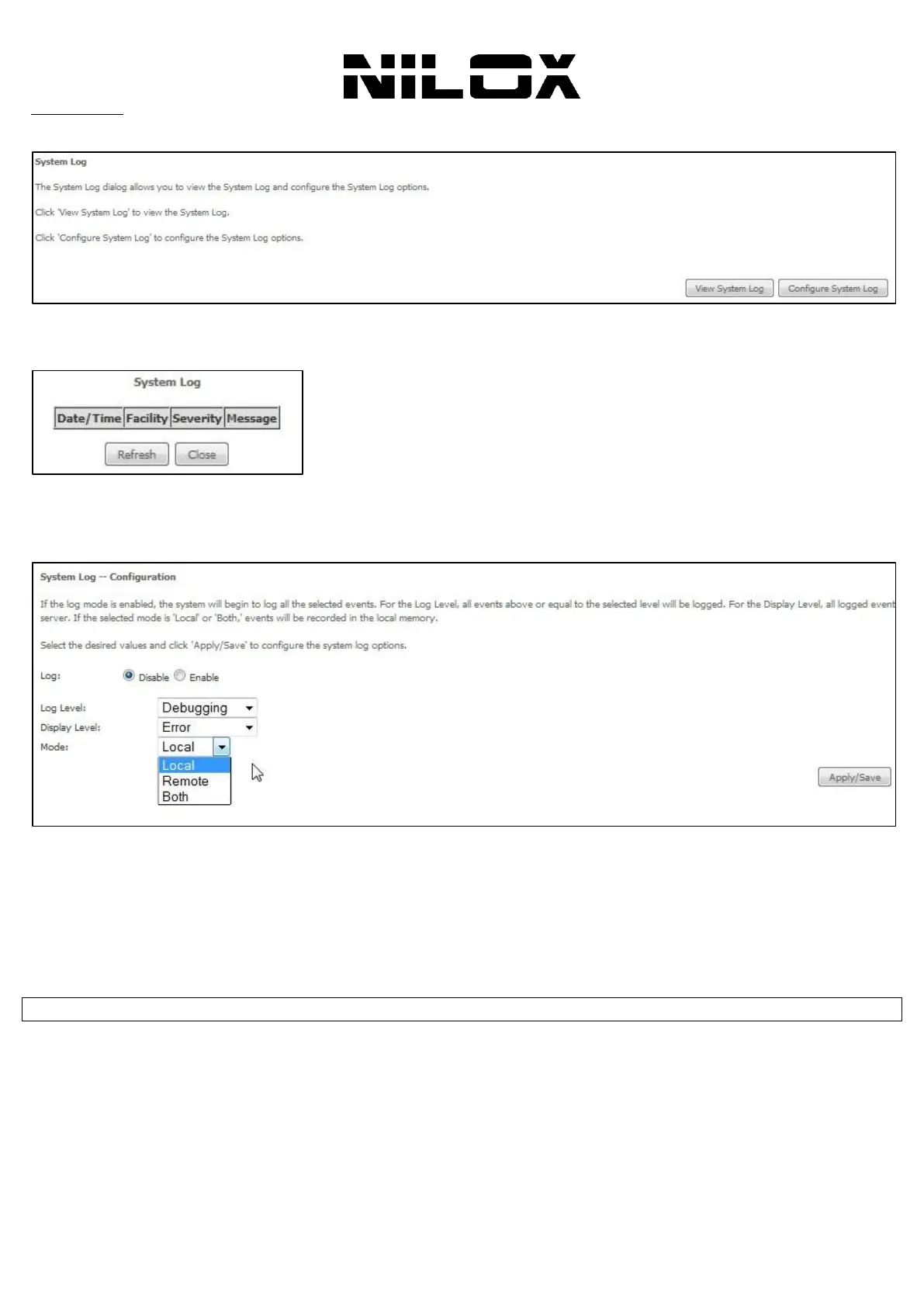 In this page, you can set 3 types of system log modes, including Local, Remote, and Both.