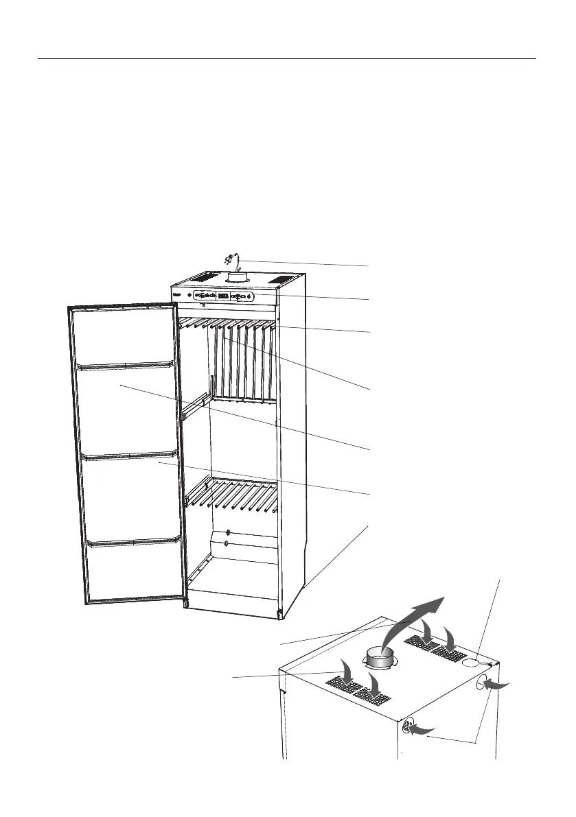 and fan components are combined in the upper part of the drying cabinet behind the con-