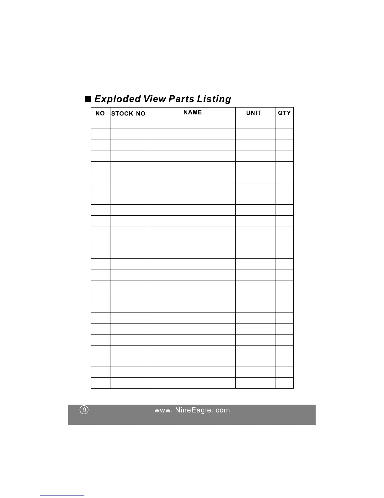 Nine Eagles Bravo SX - Parts List