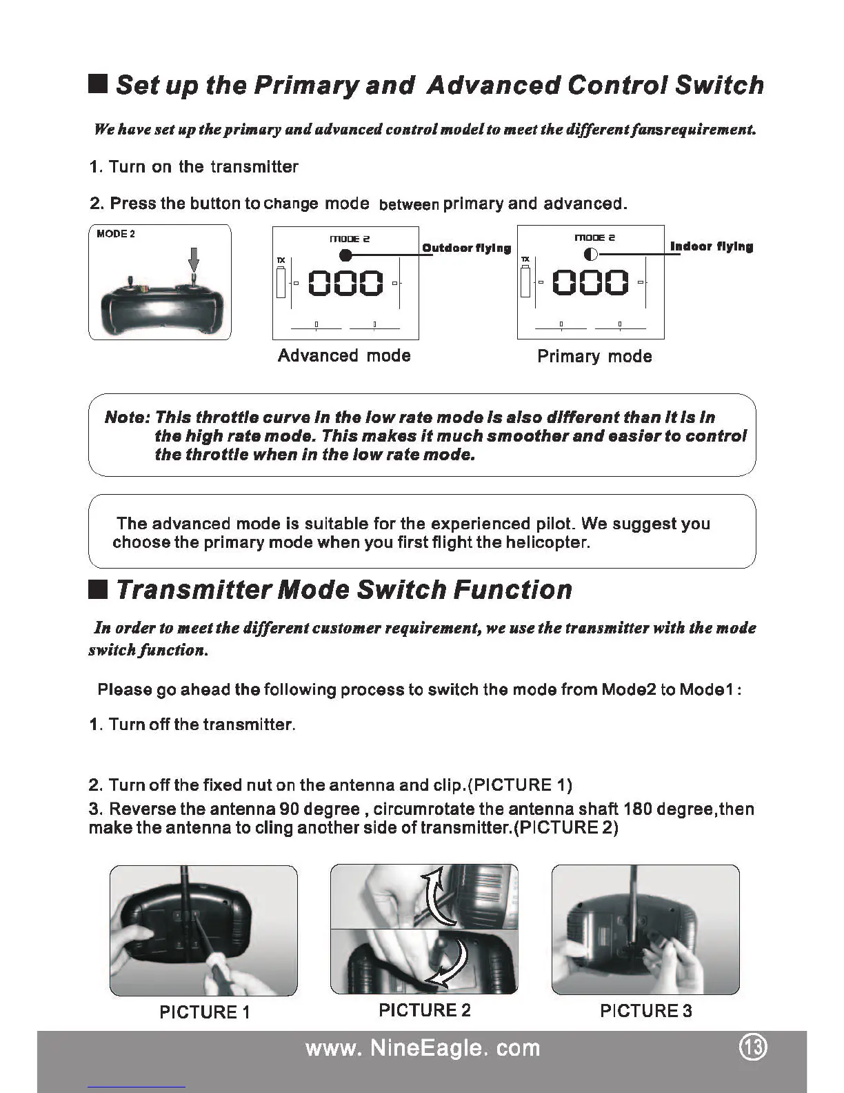 Nine Eagles SOLO PRO V - Set up the Primary and Advanced Control Switch; Transmitter Mode Switch Function
