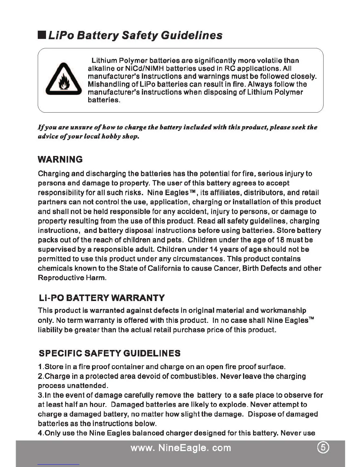 Nine Eagles SOLO PRO - LiPo Battery Safety Guidelines; WARNING; LI-PO BATTERY WARRANTY; SPECIFIC SAFETY GUIDELINES
