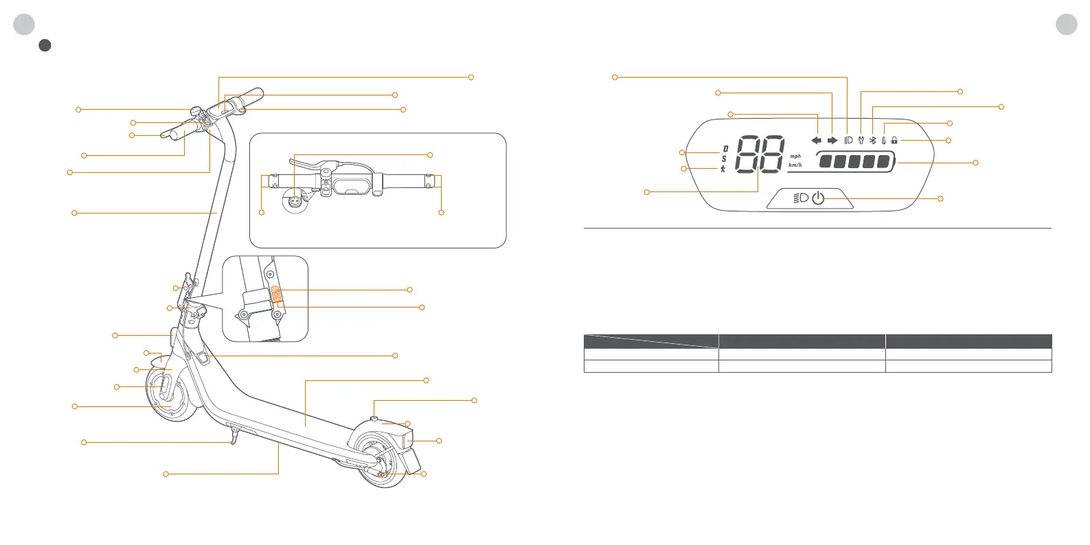 Velocímetro: Mostra a velocidade actual da scooter, bem como os códigos de erro.