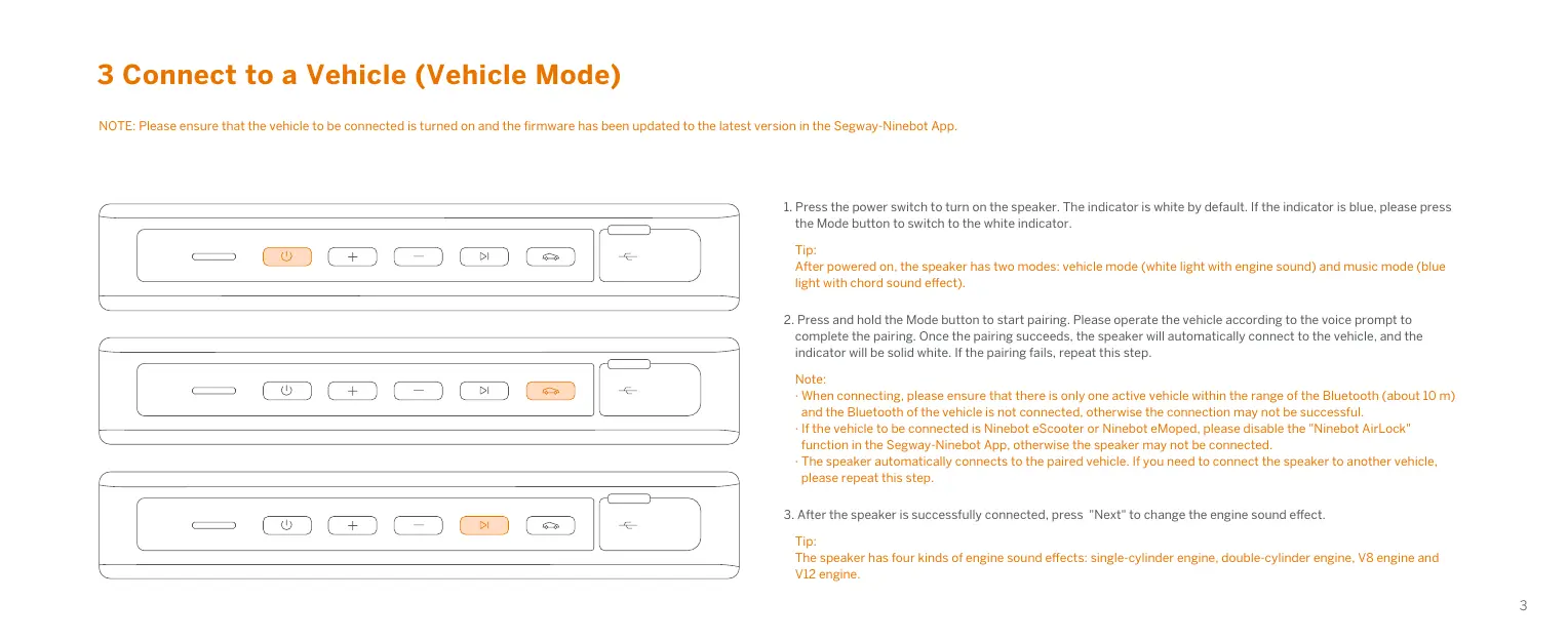 After powered on, the speaker has two modes: vehicle mode (white light with engine sound) and music mode (blue
