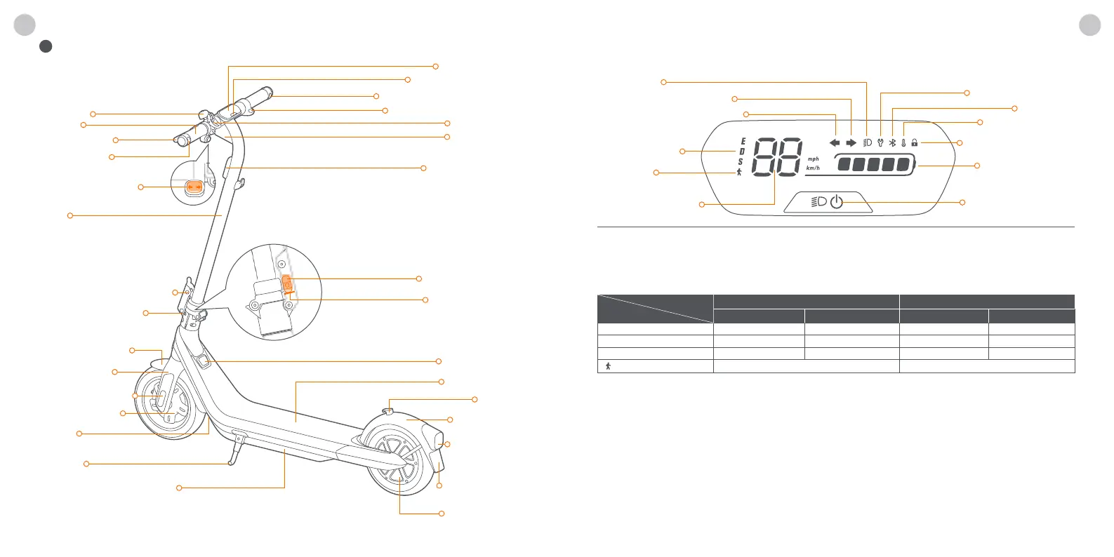 Compteur de vitesse : Il a˜che la vitesse actuelle du scooter pendant la conduite et la puissance de la batterie pendant la charge.