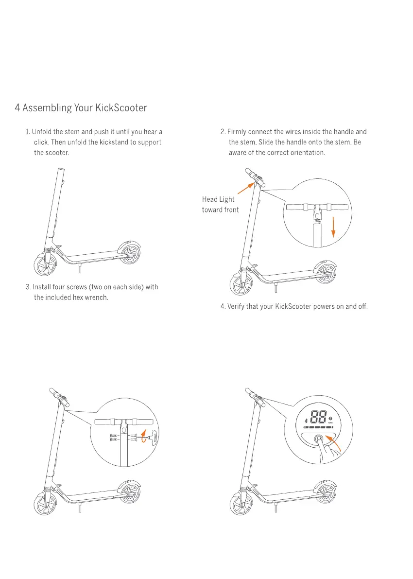 Ninebot ES2 - Assembling Your KickScooter; Stem Assembly and Kickstand Deployment; Handlebar and Stem Connection; Securing with Screws