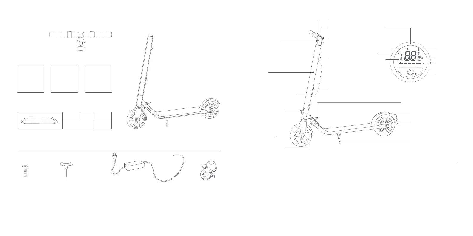 KickScooter を箱から外す時は、上記の項目がパッケージに含まれていることを確認してください。部品が不足している場合