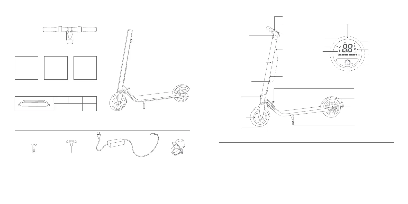 При распаковке KickScooter убедитесь, что все вышеуказанные предметы включены в пакет. Если у Вас не