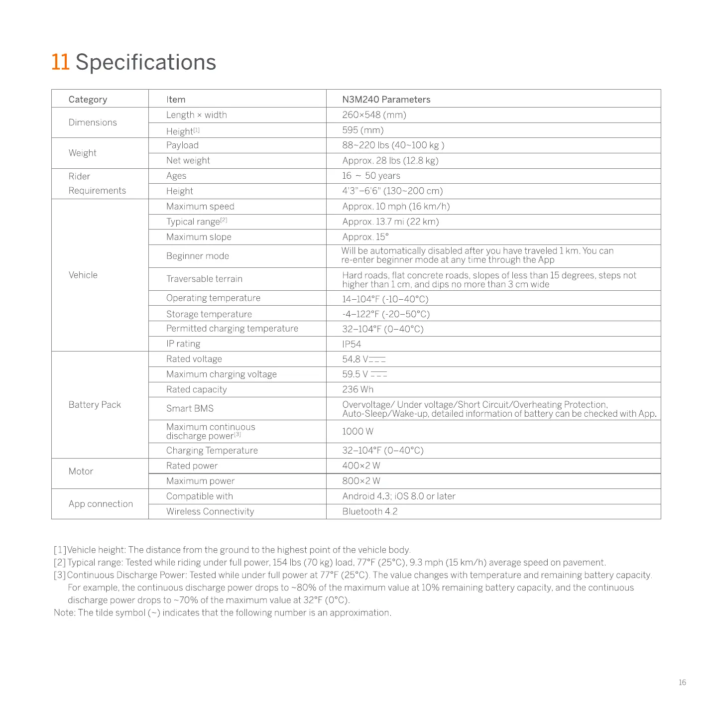 [2] Typical range: Tested while riding under full power. 154 bs (70 kg) load. 7/0F (250C), 9 3 mph (15 km/h) average speed on pavennent