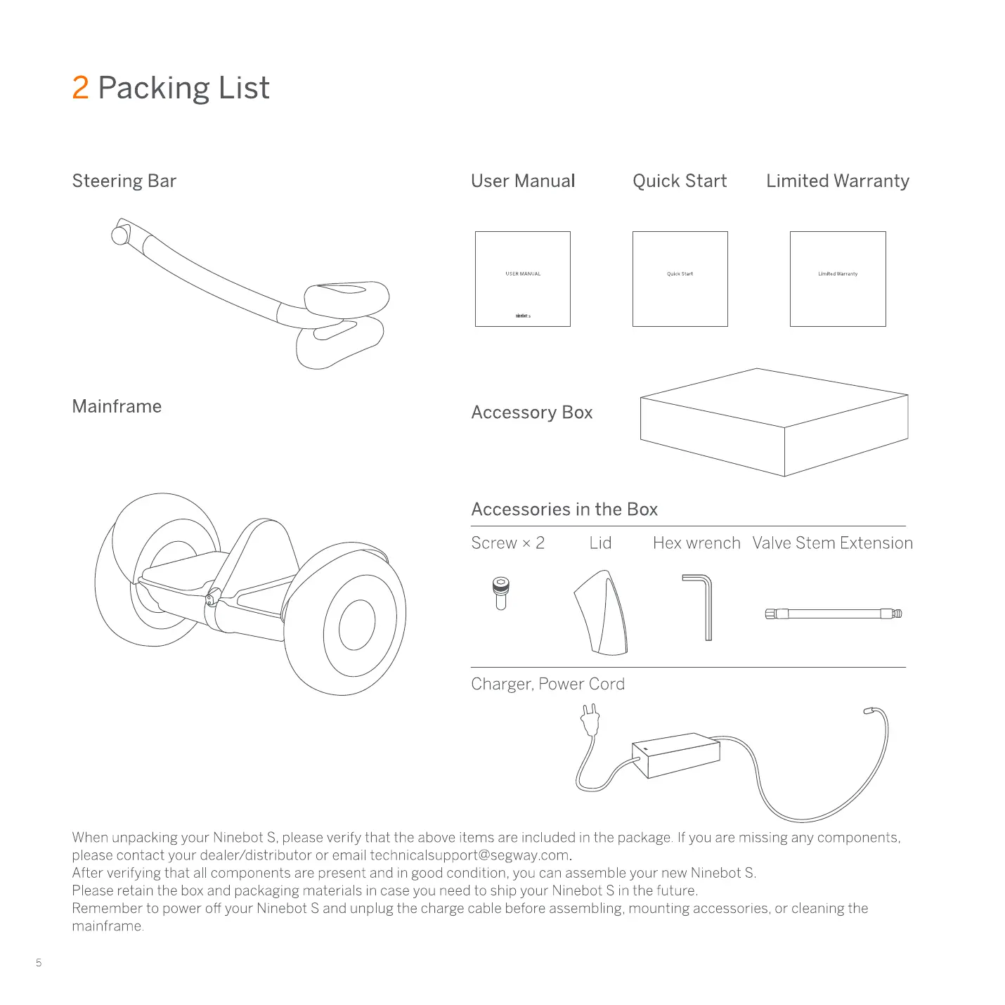 When unpacking your Ninebat S. please verify that the above items are included in the package If you are missing any components.