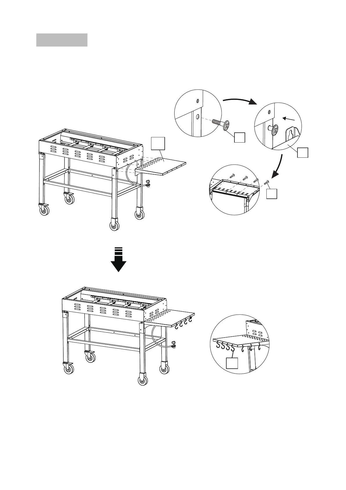 Screw 2 "Y" on the grill legs, and place the side table "E" on screws "Y".