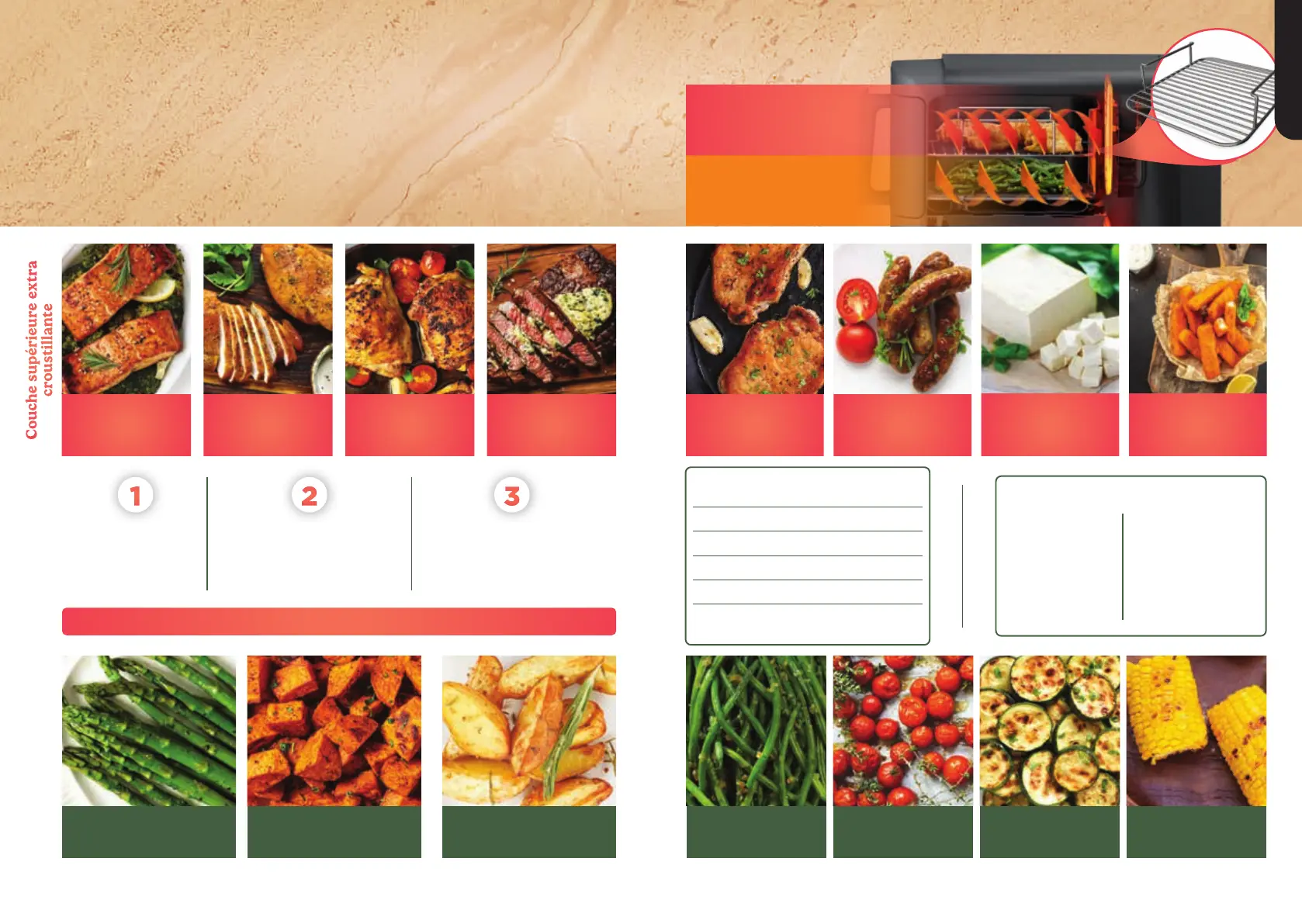 Pour de meilleurs résultats, cuire les protéines sur la couche supérieure et les légumes sur la couche inférieure.