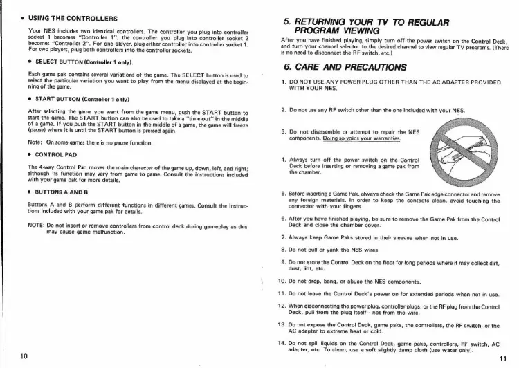 Nintendo CONTROL DECK - NES System Care and Operation Precautions; General System Handling and Safety; Game Pak and Environmental Care; Controller Button and Pad Operations