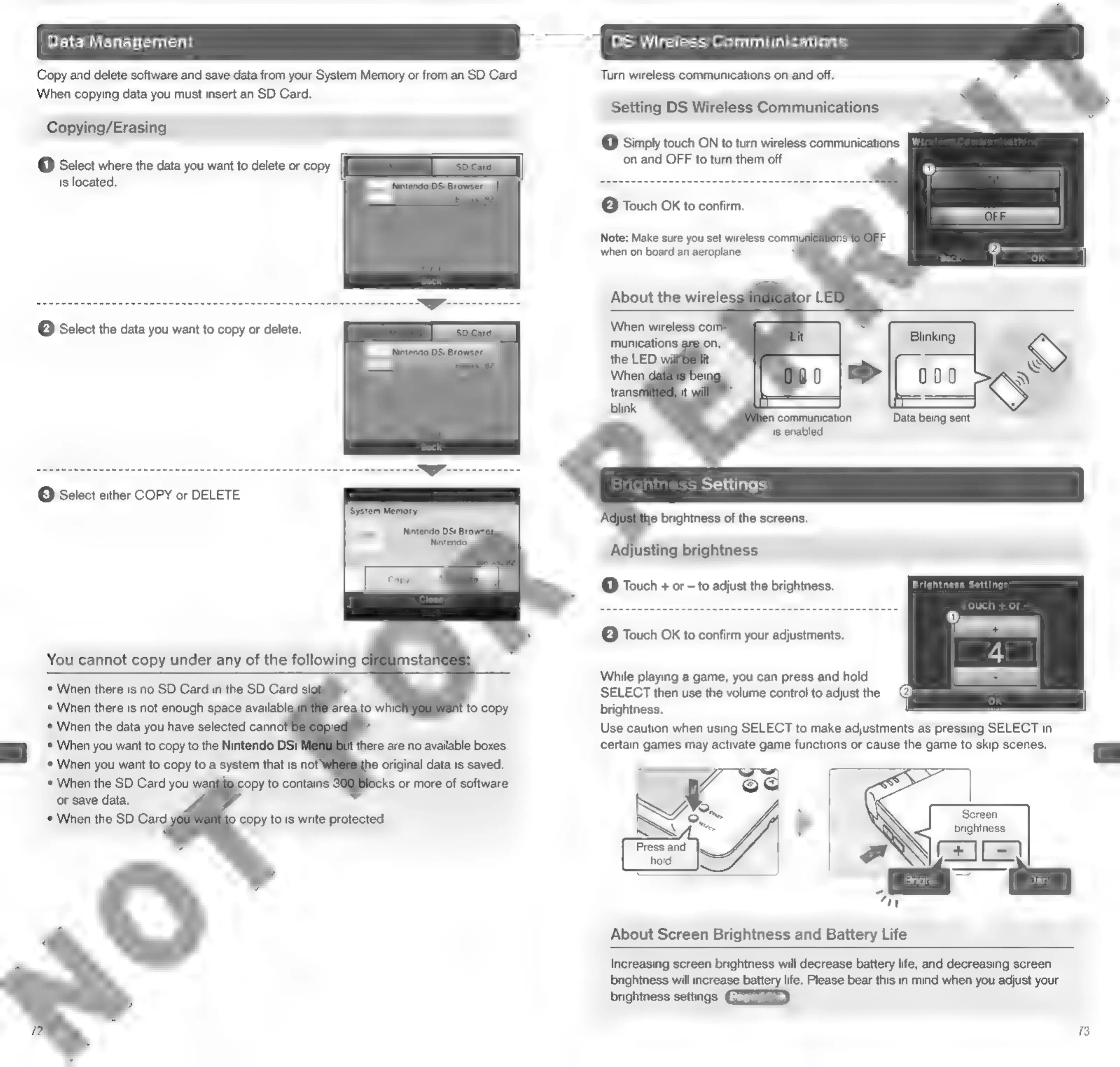 Nintendo DSI - Data Management and Wireless; Data Transfer and Wireless Setup; Brightness Adjustment