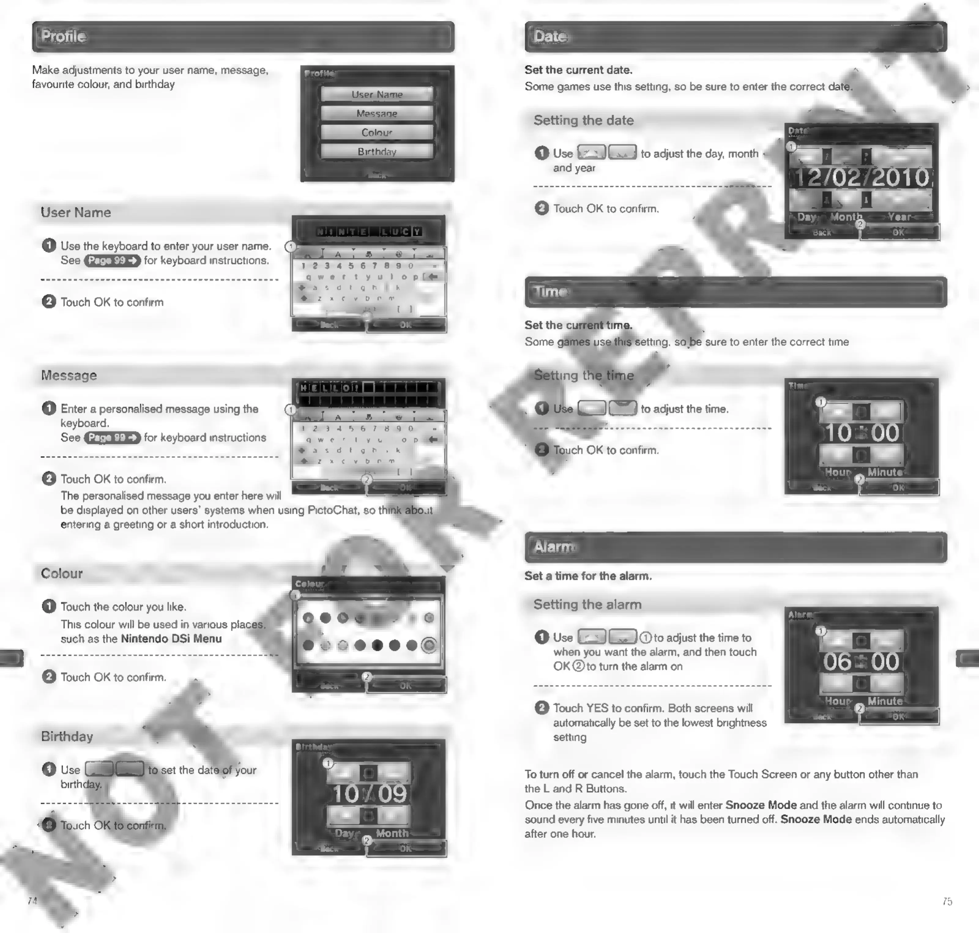 Nintendo DSI - Profile and Time Settings; User Profile, Date, and Time