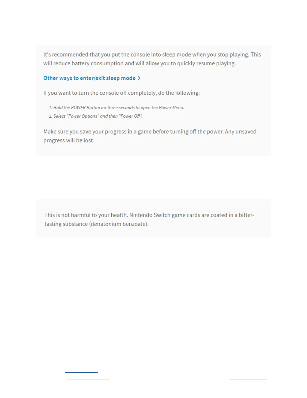Nintendo Switch - How Do I Turn the Nintendo Switch Console Off?; Other Ways to Enter;Exit Sleep Mode; After Touching a Nintendo Switch Game Card, My Hand Has a Strange Bitter Taste. Could this be Harmful?