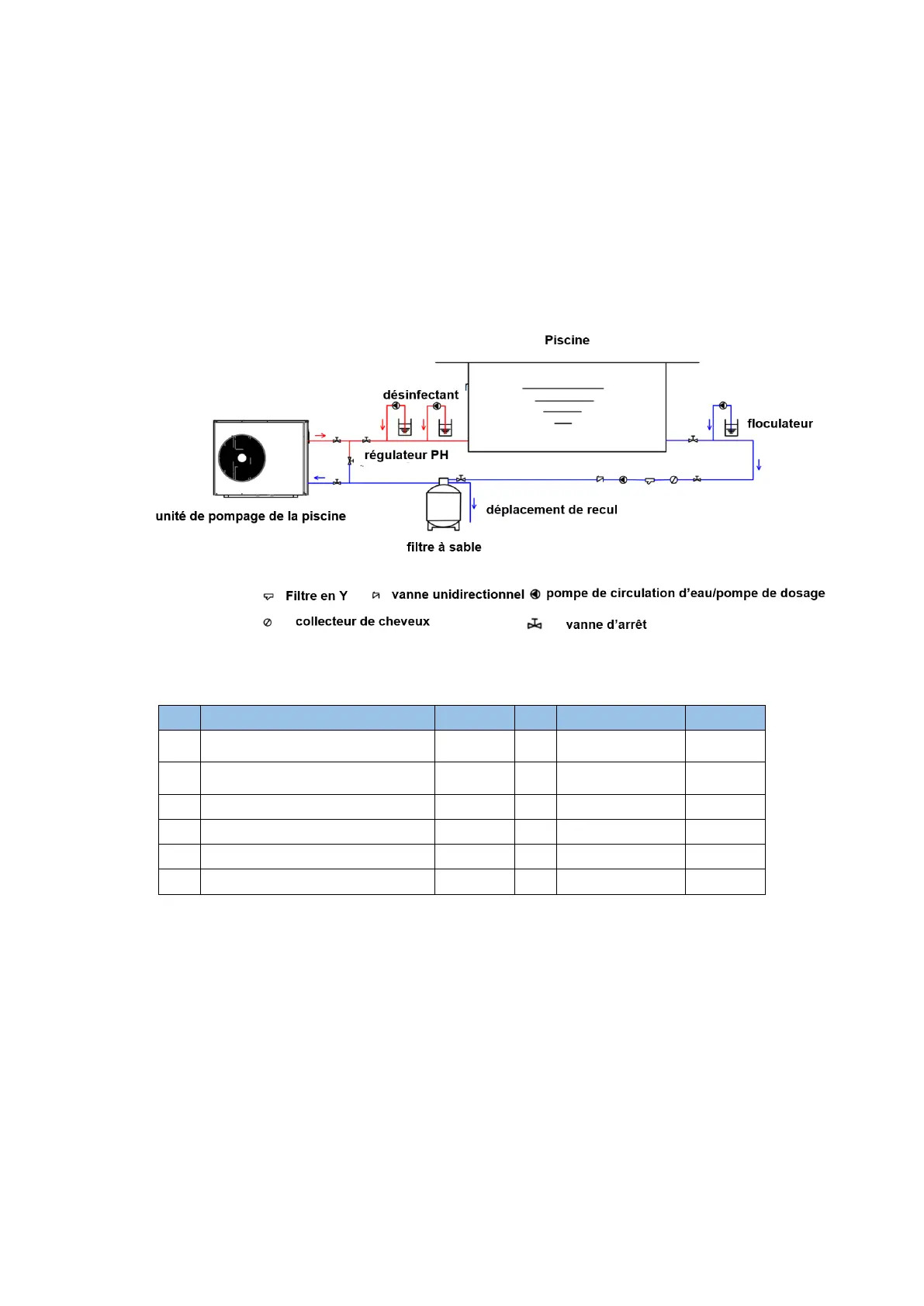 Piscine→Pompe→Filtre→Pompe à chaleur→Assainisseur→Retour à la piscine