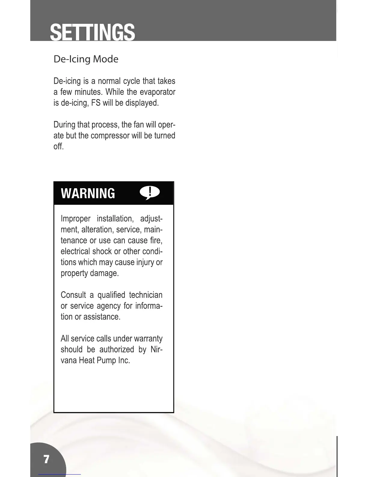 Nirvana ECO 50 - De-Icing Mode; Settings Safety Warnings