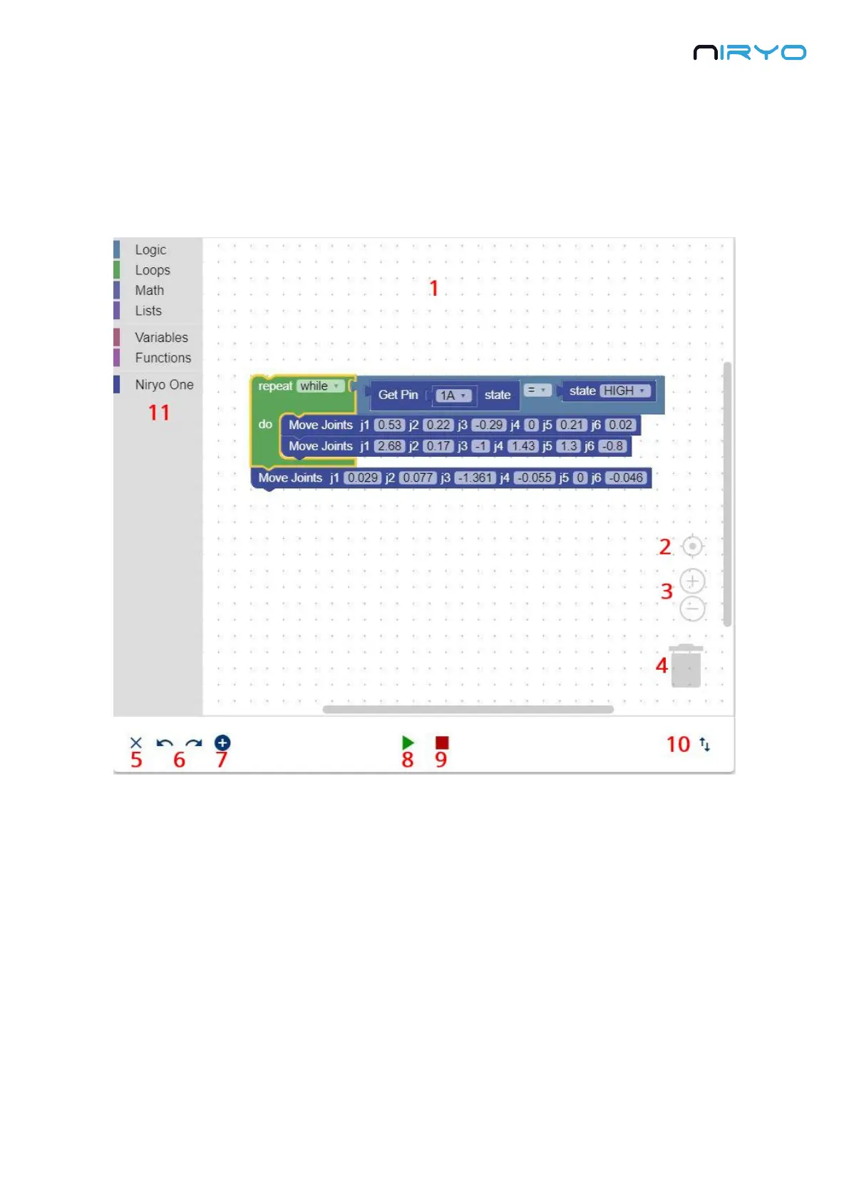To create a program, use any of the standard and Niryo One specific blocks on the left. Drag