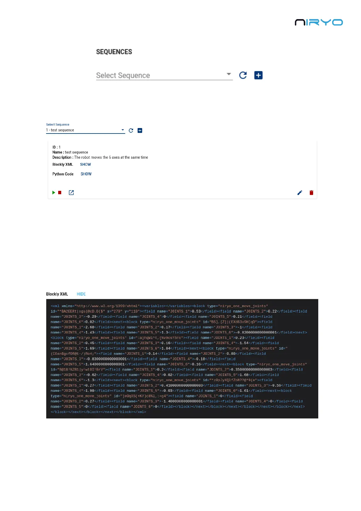 Blockly XML : the XML representation of the sequence (this is what Niryo Blocks is using