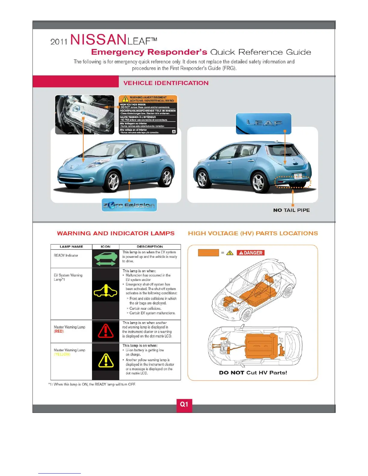 Nissan 2011 Leaf - Vehicle Identification; Warning and Indicator Lamps; High Voltage (HV) Parts Locations