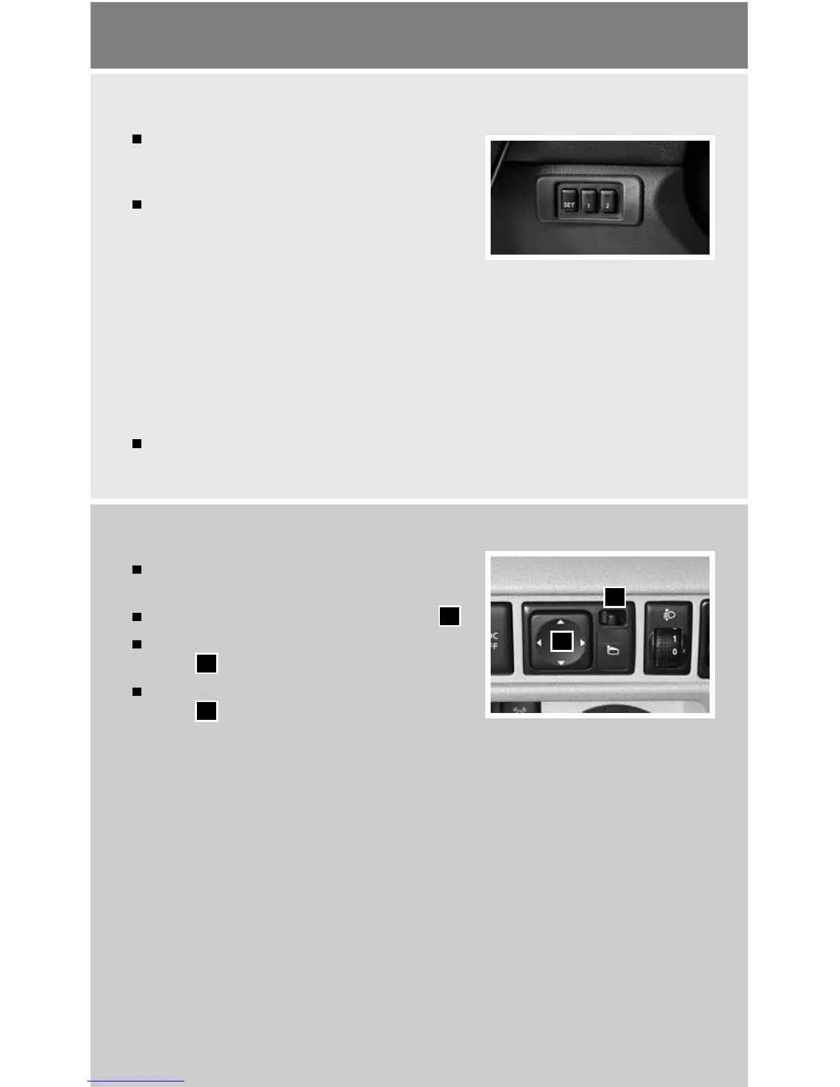 • Push the SET switch and within 5 seconds, push the memory switch (1 or 2) for at least