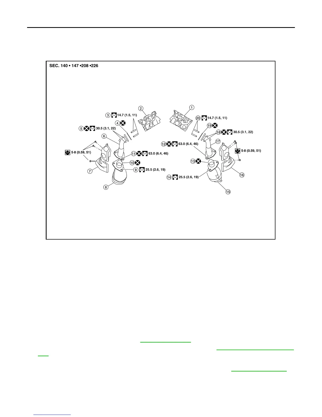 16. Exhaust manifold cover (LH) 17. Exhaust manifold (LH) 18. Exhaust manifold nuts (LH)