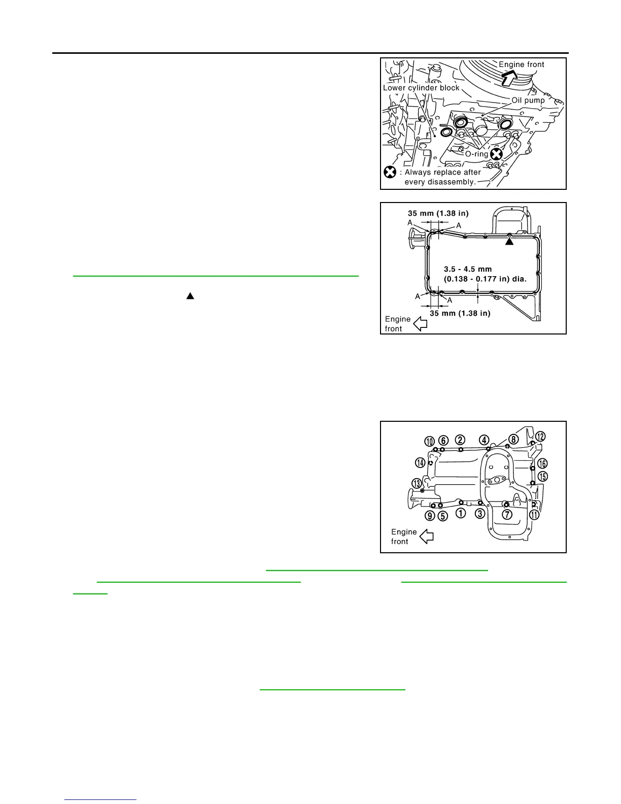 • Install avoiding misalignment of both oil pan gaskets and O-rings.