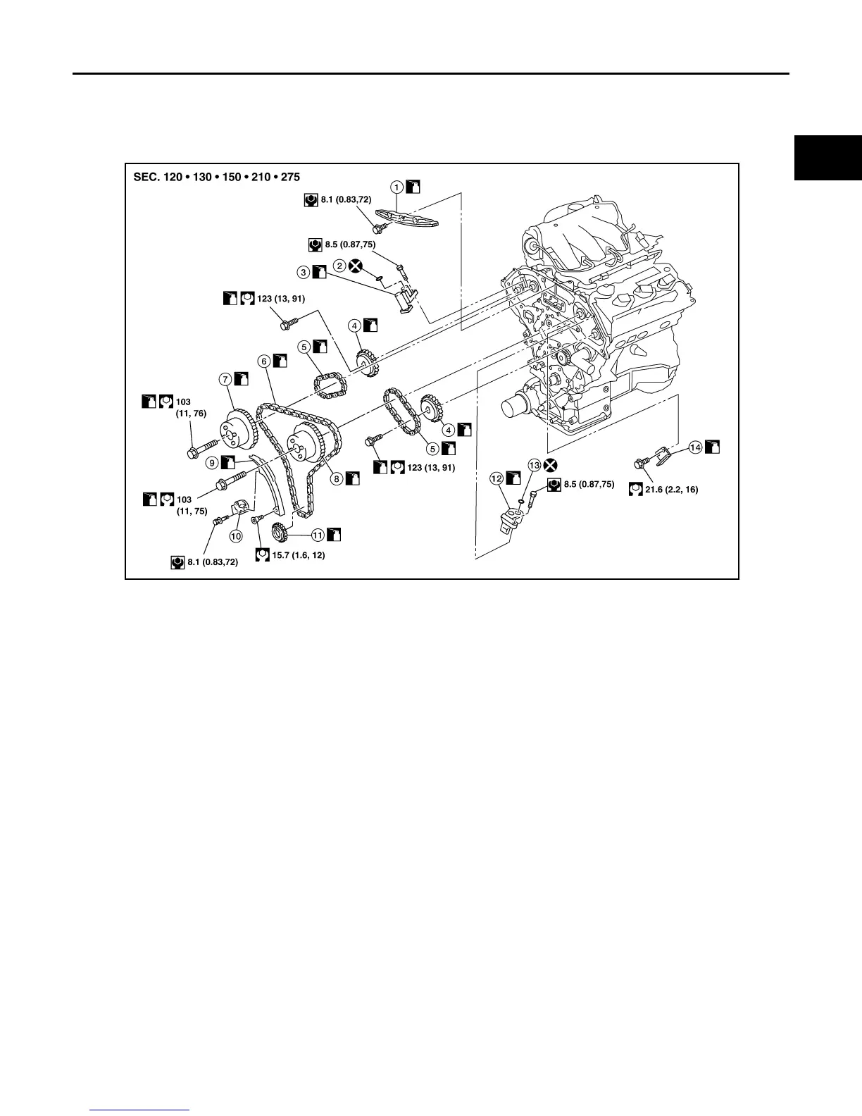 1. Internal chain guide 2. O-ring 3. Timing chain tensioner (secondary) (RH)