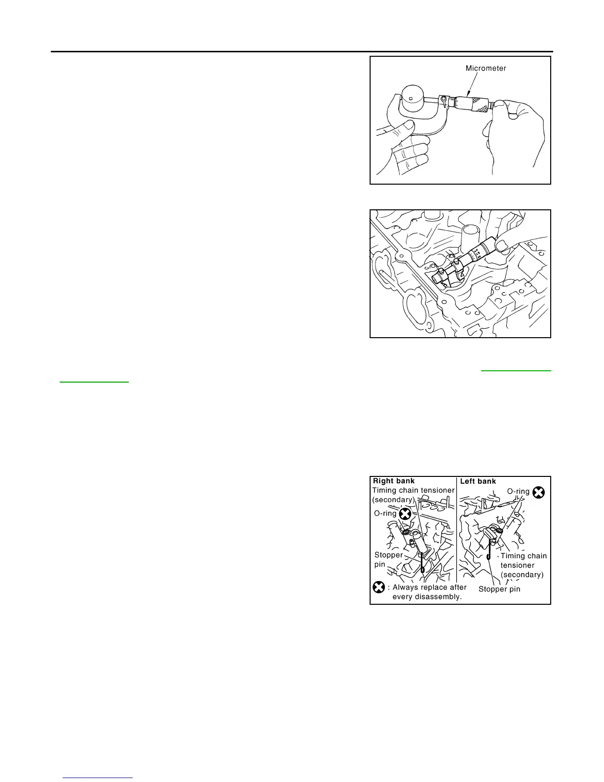 • (Valve lifter clearance) = (Valve lifter hole diameter) – (Valve lifter outer diameter), Refer to EM-129, "Stan-