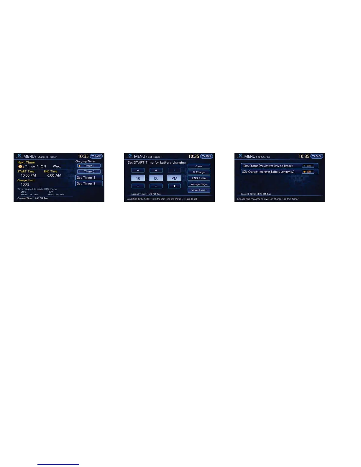 3. Touch [Set Timer 1] or [Set Timer 2]. 4. Touch [% Charge]. 5. Touch [80% Charging (Improves Battery Lon-