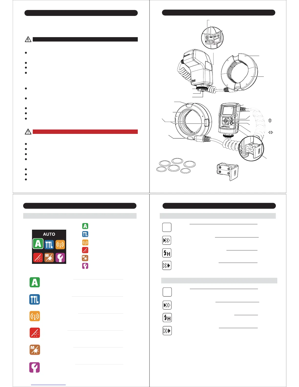 The flash unit contains high voltage electric parts. Do not try to open or repair the flash unit. Return it back