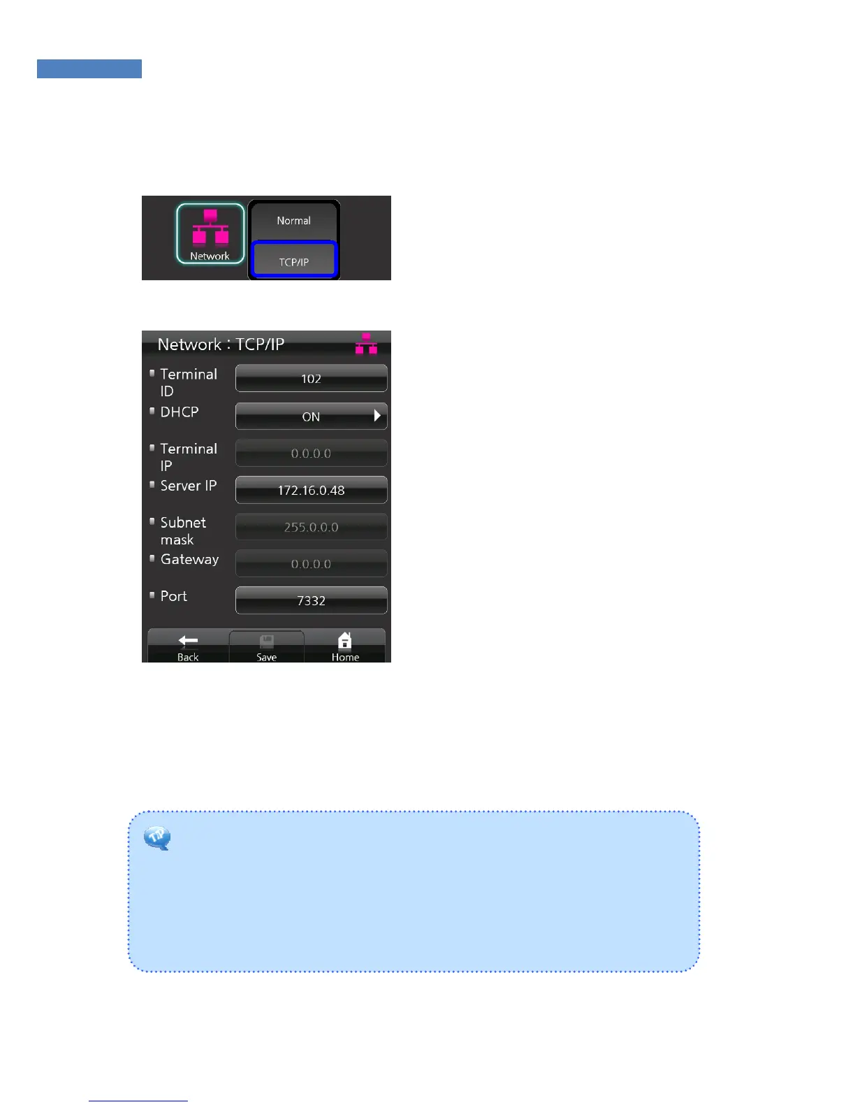 communication. If DHCP is on, related information such as terminal IP,